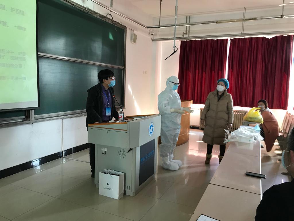 培训还详细讲解了防护服正确穿脱方法,并现场进行正确穿脱防护服演示,确保每位参训人员熟悉防护服的穿脱流程。