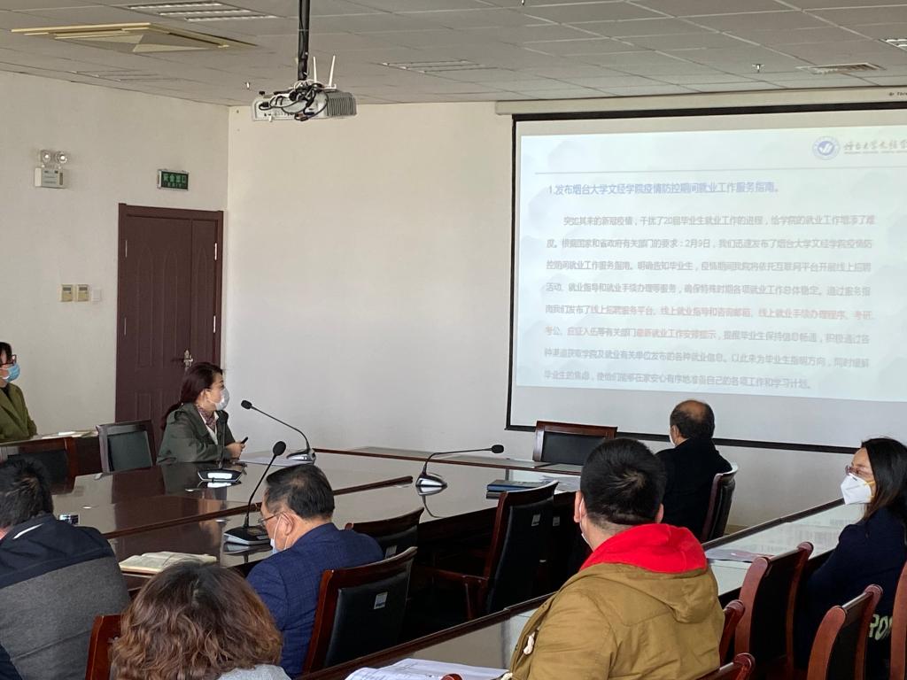 招生就业部部长李洁带领与会人员共同回顾学院在疫情期间各项就业工作开展情况,组织学习了国家及省各有关单位下发的关于应对新冠肺炎疫情期间促进高校毕业生就业的各项通知精神并通报了全省非师范类高校毕业生就业工作情况。会上对2020届毕业生有关情况进行介绍,针对我院作为齐鲁名校线上集中招聘会之一的高校,就如何做好下一阶段的就业工作进行部署。