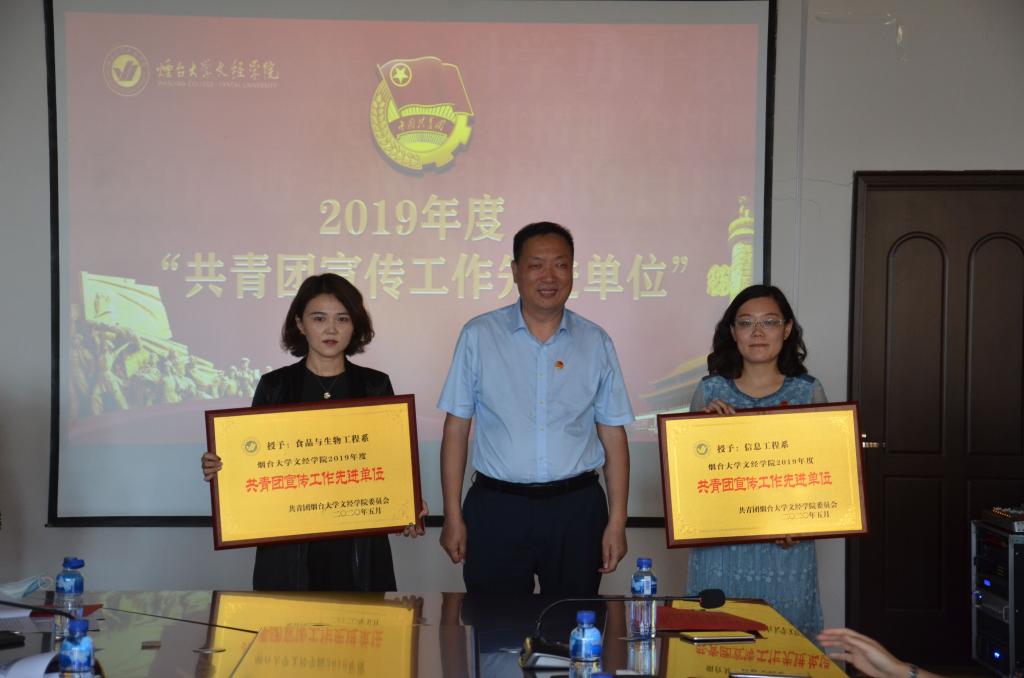 值此疫情防控的特殊时期,表彰大会紧扣“决战决胜、青春向前”主题,展现了新时代文经人不屈不挠、团结奋进的坚定信念。会议回顾了过去一年以来我院共青团工作取得的成绩,院长助理莫红菊宣读了《烟台大学文经学院2019年度共青团工作先进集体及个人表彰决定》,学院领导为获奖单位和个人代表一一颁发奖牌和证书。