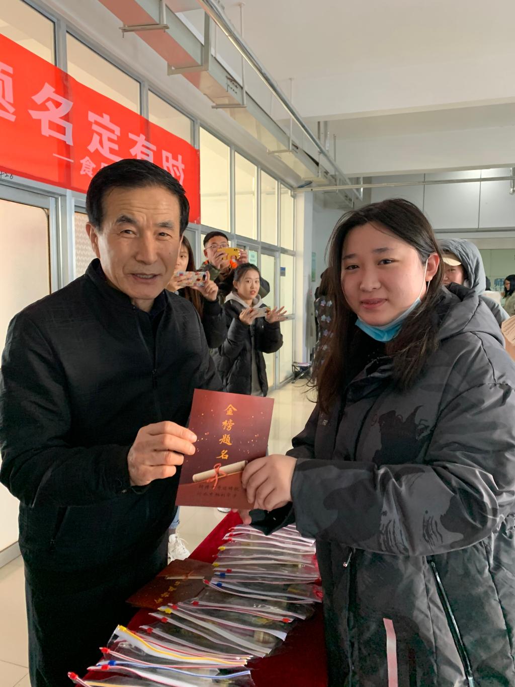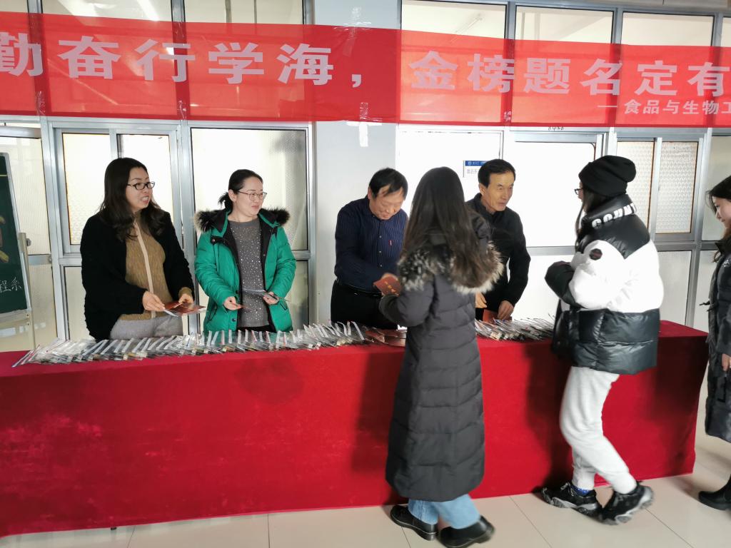 为给考研学子加油鼓劲、增添动力,食品系于12月16日在二教B区4楼大厅为考研学子发放暖心小礼包,食品系主任金海珠、学生工作负责人王少辉、党总支副书记赵蓓、团总支书记王晶以及各毕业班班主任出席本次活动。