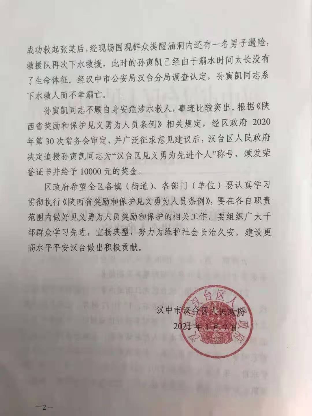 孙寅凯校友在校期间刻苦努力,积极向上;工作后勤学善思,敬业爱岗,连年被评为先进工作者和优秀公务员。2020年8月17日,因救驾车途经涵洞被困水中的前同事不幸溺亡,享年34岁。2021年1月7日,陕西省汉中市汉台区人民政府追授孙寅公凯同志为“汉台区见义勇为先进个人”荣誉称号。