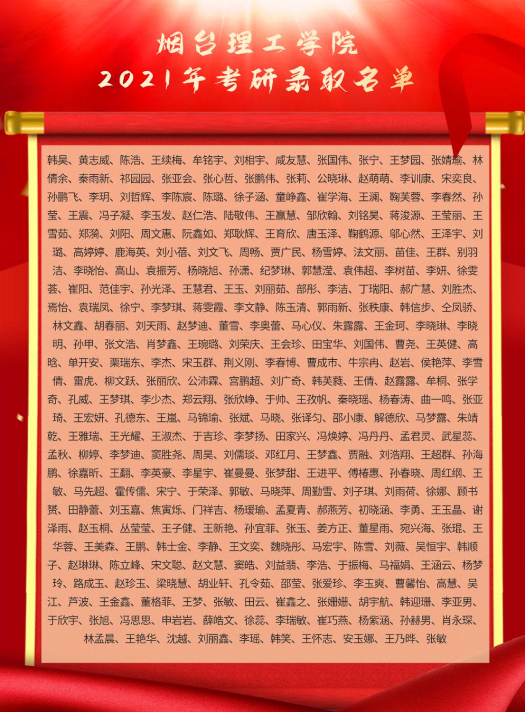 又是一年收获季,又是一年报喜时,近日,2021年考研录取信息公布,我校考研喜报频频传来。据统计,我校共有1150名同学报考研究生,其中297名同学被高校录取,录取率为10.65%,报考录取率为25.83%。其中26名同学被中国海洋大学、中国石油大学、哈尔滨工程大学等985和211高校录取。