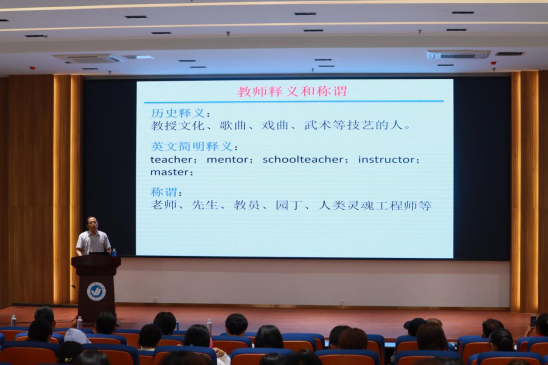 本次报告会特邀烟台大学化学化工学院院长李庆忠教授来我校进行教育分享。大会开始,由李庆忠教授对教师这一职业称谓做出全方位的解释。他从爱国守法、爱岗敬业、关爱学生、教书育人、为人师表、终身学习六个角度教师的职业规范进行阐述,通过列举古往今来多个榜样人物的经典故事,使老师们进一步明确了教学目标和教学方向。