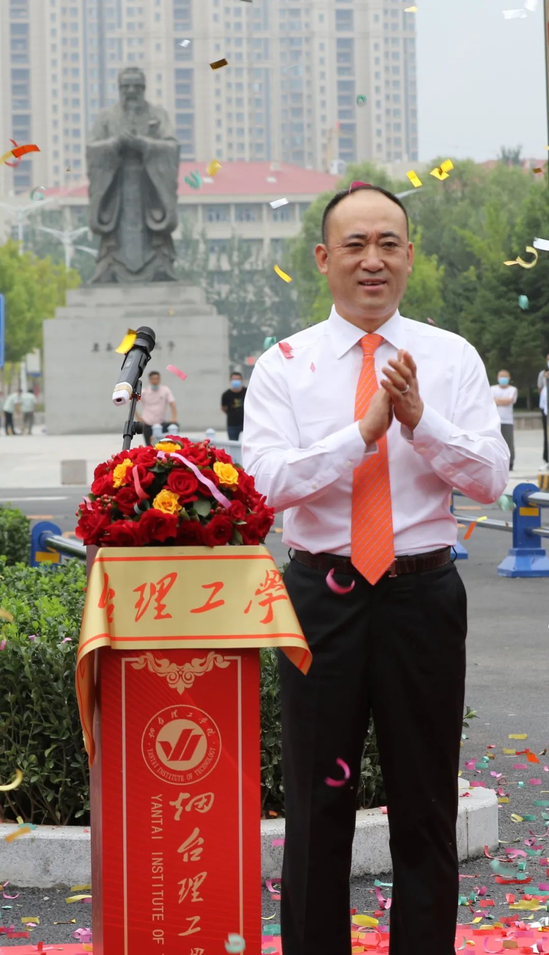 新校门剪彩在隆重热烈的气氛中举行,烟台理工学院副校长苏春景教授主持仪式。在热烈的掌声中,烟台理工学院董事长辛军发表了充满深情厚意又寄托殷切期待的致辞。他指出,校门的变迁,见证了学校不断发展的进程,展示了学校自强不息的精神,蕴含着全校师生员工憧憬未来的美好愿景!我们将站在新的历史起点上,承前启后、继往开来,同心同德、干事创业,共筑烟台理工学院辉煌灿烂的美好明天!现在,我宣布烟台理工学院新大门落成启用!在现场嘉宾的注视和共同期待下,董事长与各位领导一起为新校门启用剪彩。此时此刻,礼炮向天齐鸣,礼花腾空而起,现场气氛热烈,全体烟理工人将站在又一个新的起点上,承前启后,继往开来。