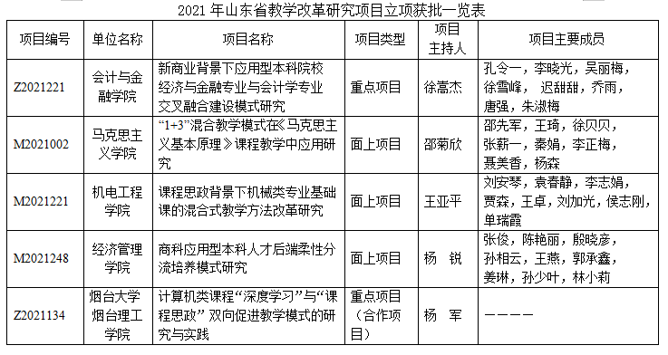 新年伊始,喜报频传。日前,山东省教育厅发布了《山东省教育厅关于公布2021年本科教学改革研究项目立项名单的通知》(鲁教高函21-43号),我校推荐申报的5个项目,全部获批立项,其中重点项目1项,面上项目3项,合作项目1项。获批项目数量和质量均创历年新高。