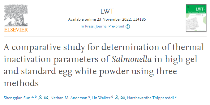近日,我校食品与生物工程学院留美博士孙盛千副教授联合美国北卡罗来纳州立大学助理教授Dr.Walker在国际顶级期刊 《LWT-Food Science and Technology》(中科院SCI 1区TOP,JCR 1区,IF=6.056)发表了题为“A comparative study for determination of thermal inactivation parameters of Salmonella in high gel and standard egg white powder using three methods”的研究论文。该论文的第一作者单位和通讯作者单位均为烟台理工学院,北卡罗来纳州立大学为共同通讯作者单位。