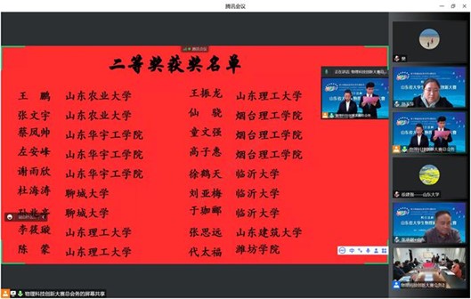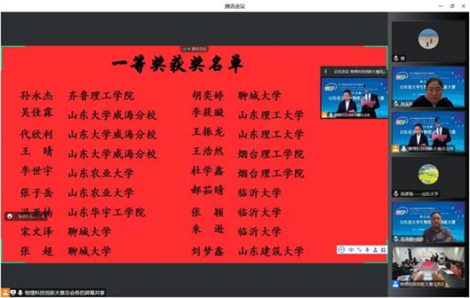 大赛共有223项优秀作品进入决赛,项目涉及力学、光学、电磁学等多个物理学学科分支。赛事采用线上评比,我校派出1位评审专家,1位带队教师,8组参赛队伍24名同学参加,比赛现场设置在3教S516创新实验室。经过评比,我校共取得了山东省一等奖2项、二等奖3项、三等奖3项的好成绩,得到了大赛组委会的高度评价。