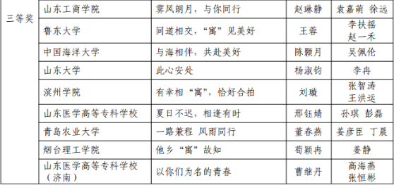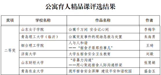 近日,由山东省教育厅主板、山东省学校后勤协会高校公寓分会承办的《关于2022 年高校“公寓的故事”主题系列活动》评选结果公布。此次活动全省共125所高校参与,共推荐1128件作品,参与学校数量和推荐作品数量均创历史新高,我校《人与人和谐——“宿舍矛盾那些事”》获公寓育人精品课二等奖,征文作品《他乡“寓”故知》获公寓文化活动征文三等奖,在同类院校中成绩斐然。