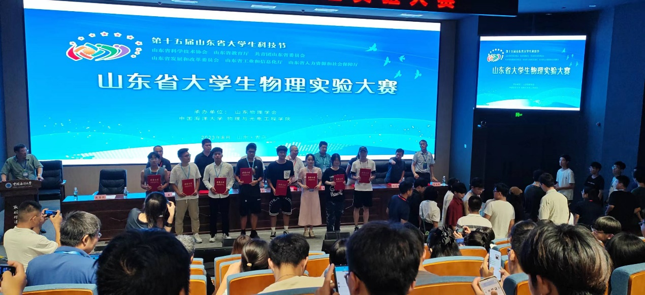 8月16日,2023年山东省大学生物理实验竞赛在中国海洋大学圆满落幕,我校斩获7项佳绩。本次比赛由山东省科协、山东省教育厅、共青团山东省委、山东省发展和改革委员会、山东省工业和信息化厅、山东省人力资源和社会保障厅主办,山东物理学会、中国海洋大学、聊城大学、山东科技大学承办,竞赛线下进行,来自省内高校368支队伍参赛。本届大赛内容涵盖命题类创新作品、自选课题类创新作品、大学生物理实验讲课比赛和大学生物理科技创新比赛四个类别。