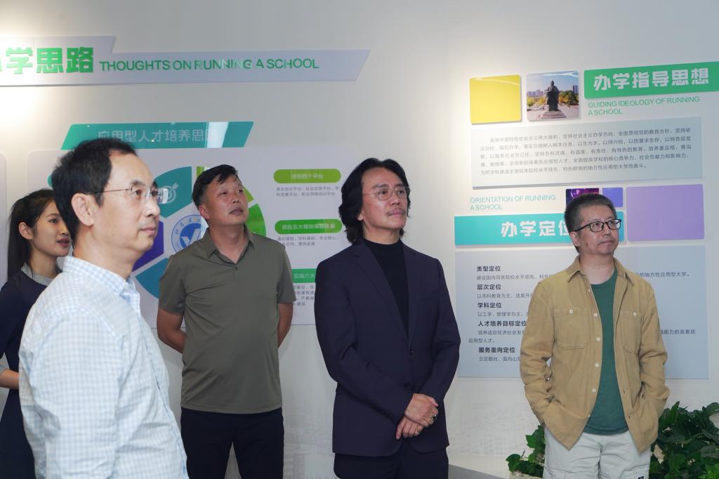 会见座谈之前,创作团队在学校领导的陪同下参观了学校校史馆,观看了学校建校20周年的宣传片,校长于光辉介绍了学校在管理与治理、应用型人才培养和适合的教育理念下的个性化教育等三方面特色。团队和学校双方就音乐剧人才培养的办学条件、师资队伍建设风方面进行交流,表示将各自领域优势,整合优质资源,积极探寻合作方式。