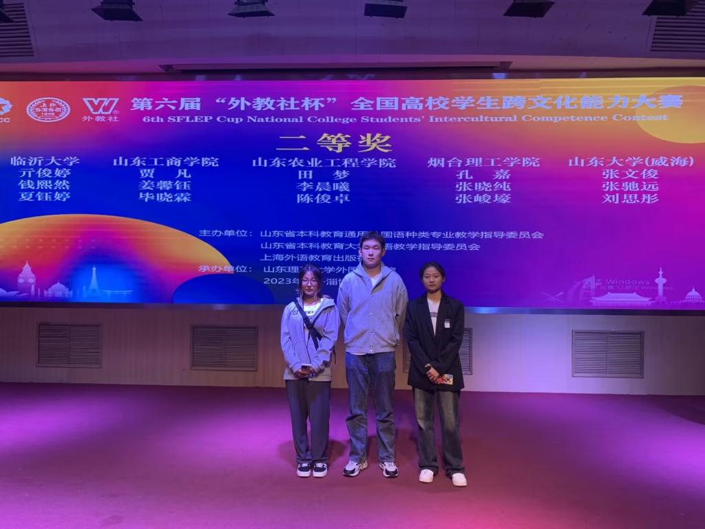本次大赛由指导教师李海楠(大学英语组)、李工科(大学英语组)、王心韵(商务英语组)带领的外2104-1张晓纯、会2251-3张峻壕、信2202-1孔嘉三位同学组成的团队代表我校参加山东省复赛。比赛过程中,我校学子发挥稳定,表现优秀,在50个高校团队中以优异的排名荣获本科组山东省赛区二等奖。