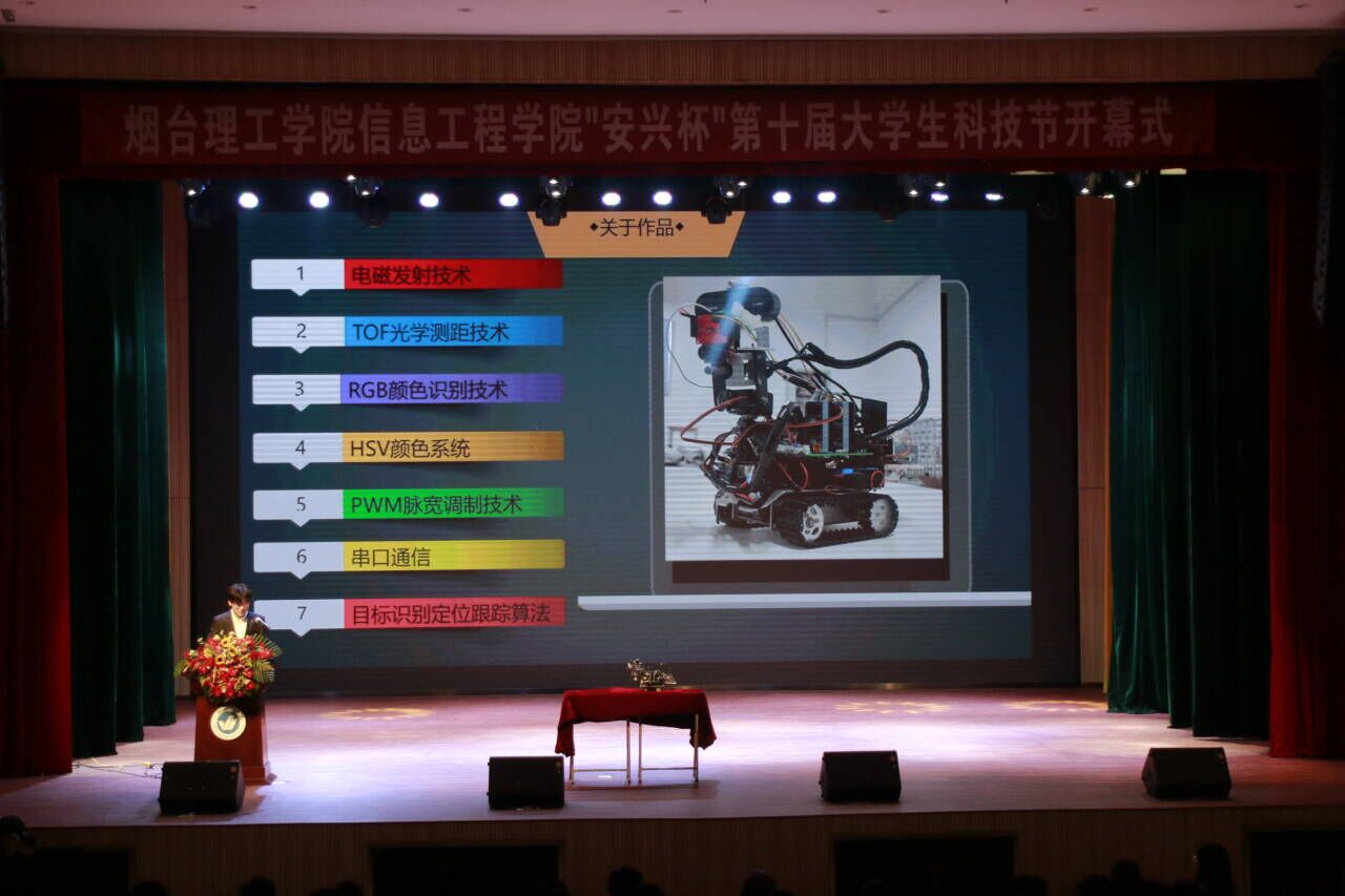 在优秀科技竞赛作品展示环节,李晓冰带领其第九届山东省互联网+大学生创新创业大赛银奖团队展示了“海的触角”项目,王浩然展示了在全国大学生物理实验竞赛中获得优秀奖的“自动瞄准电磁炮”项目,充分展现了信工学子的科技创新能力。本次活动赞助单位济南安兴电气科技有限公司展示了其公司研发的多款智能化产品,开阔了同学们的视野。