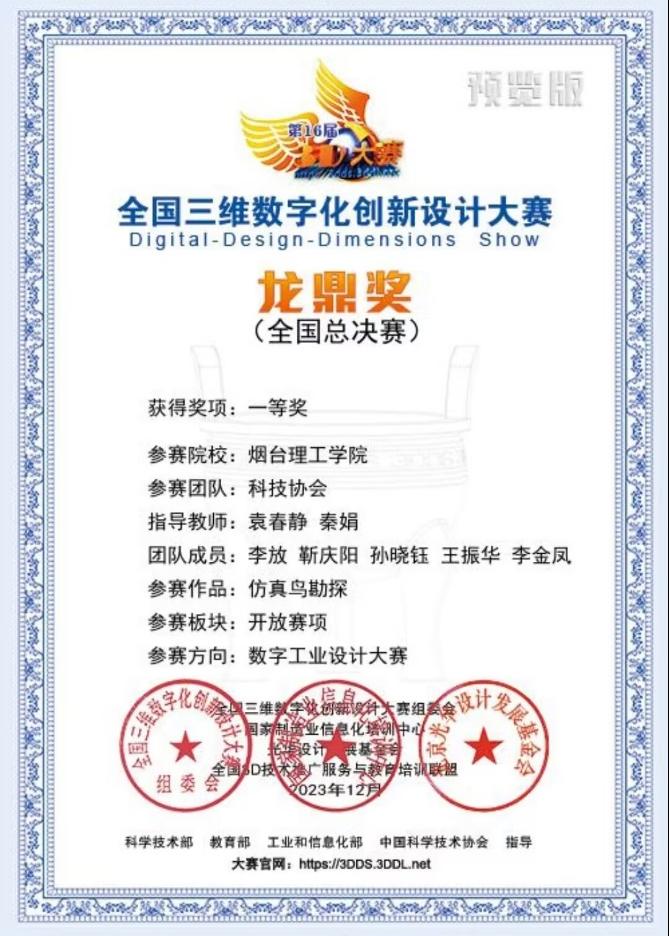 近日,第16届全国三维数字化创新设计大赛年度总决赛榜单揭晓,我校机电工程学院参赛作品首次荣获国家一等奖!在袁春静老师和秦娟老师的指导下,机电工程学院李放、靳庆阳等同学的参赛作品《仿真鸟勘探》通过运用三维数字化技术和创新设计理念,对仿真鸟无人机的设计和开发,借助先进的图像处理和数据分析算法,能够准确识别和定位地下矿藏、油气资源以及环境污染等关键信息,实现了对野外环境的高精度勘探和数据收集。该作品经过校赛、省赛层层选拔入围年度总决赛(国赛)参与角逐龙鼎大奖,最终荣获国家级一等奖,打破了我校有史以来该项赛事的获奖记录!