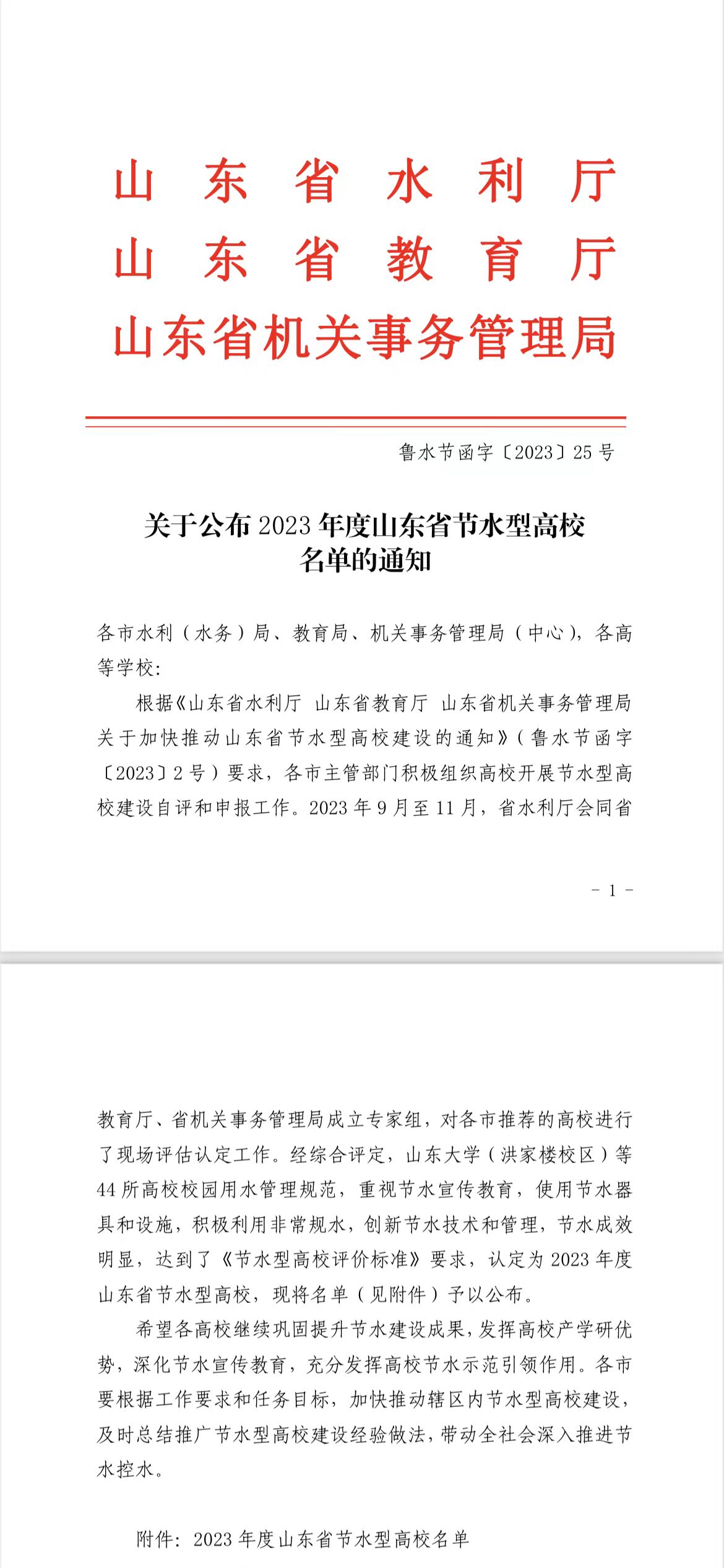 近日,省水利厅、省教育厅、省机关事务管理局联合公布2023年度山东省节水型高校名单,我校获评山东省“节水型高校”荣誉称号。