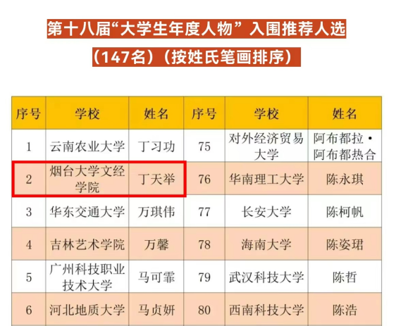 日前,由教育部、人民日报社共同指导,人民网、光明日报教育体育部、大学生杂志和中国大学生在线联合主办的第十八届“大学生年度人物”推选展示活动结果公示。我校丁天举同学经层层选拔,成功入围第十八届“大学生年度人物”推荐人选,这也是我校学生首次入围全国200强获此殊荣。