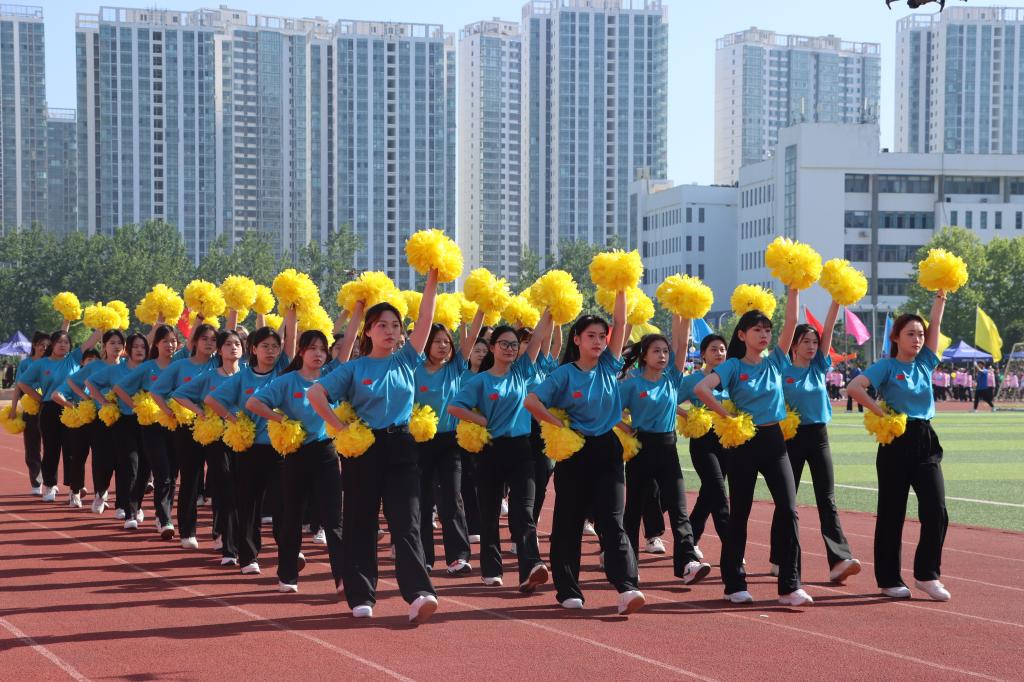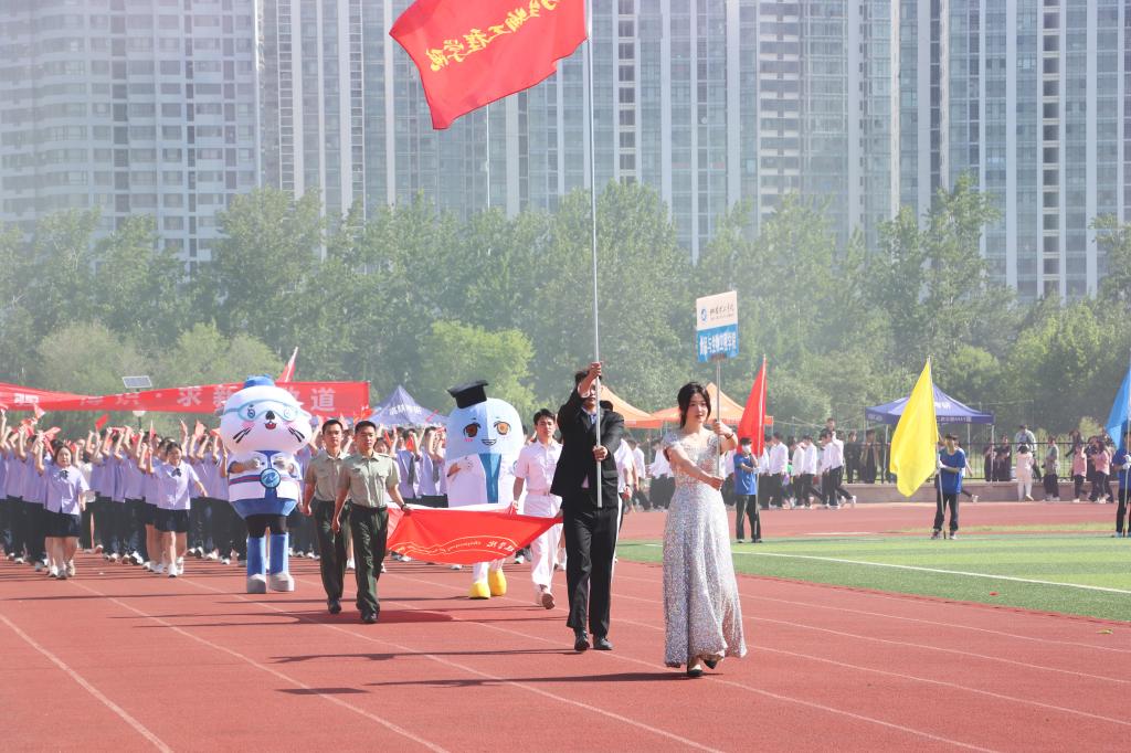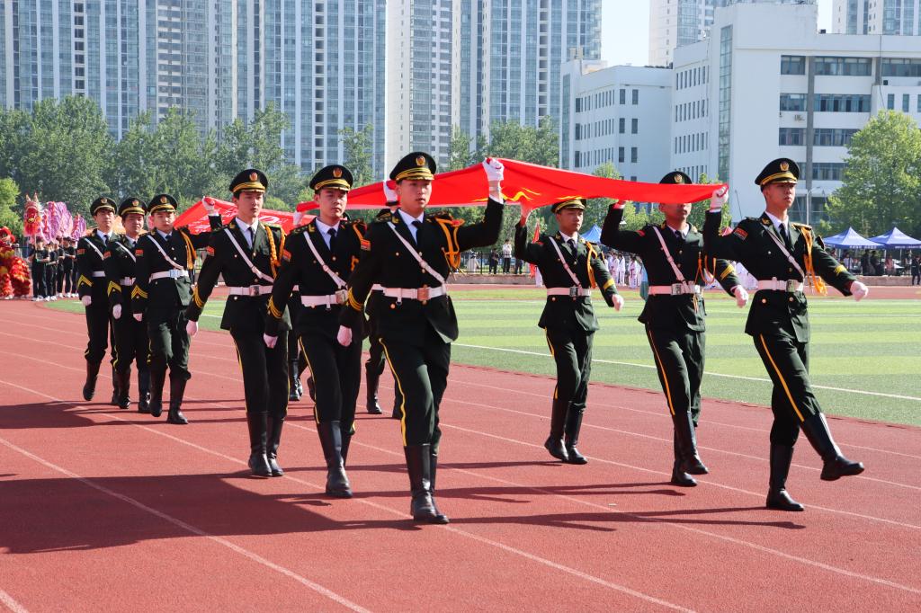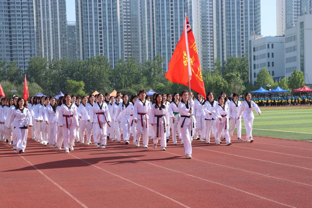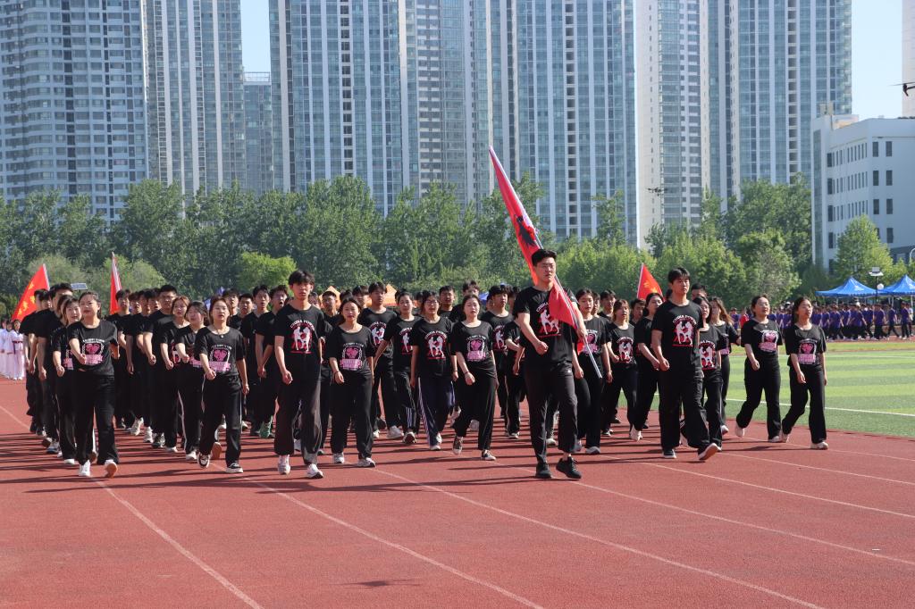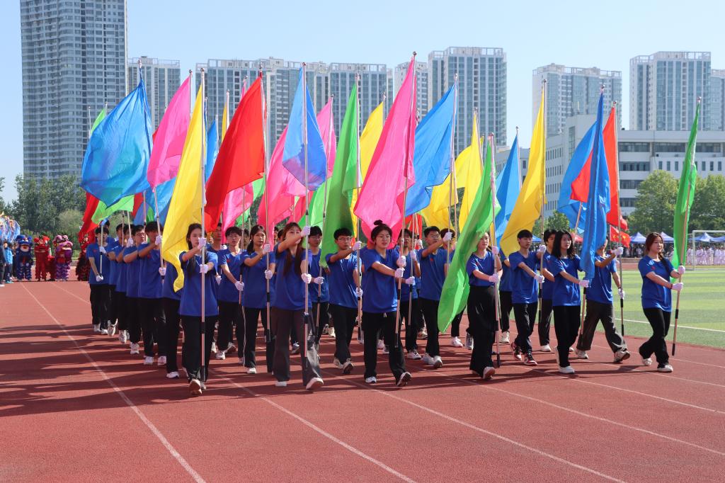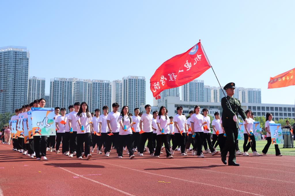 随着激昂的鼓乐声,国旗护卫队带领各方队以饱满的精神,整齐的步伐依次通过主席台。现场气氛热烈,别出心裁的展板、铿锵有力的口号、迎风招展的彩旗……,无不展示着师生们健康自信、昂扬向上的精神风貌。