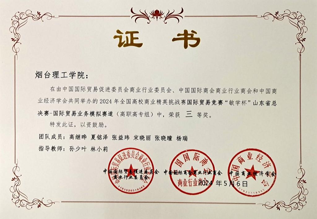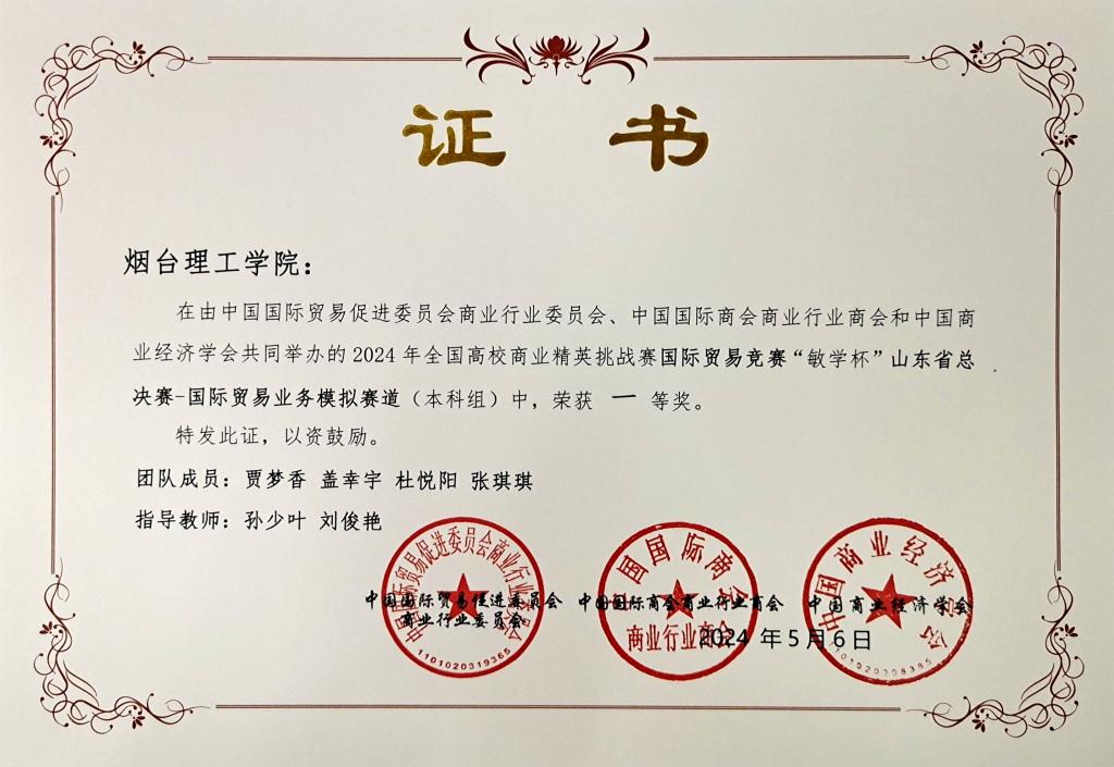 近日,由中国商业经济会等单位主办的2024年全国高校商业精英挑战赛国际贸易竞赛(国际贸易业务模拟赛道)山东省总决赛圆满落幕。经过激烈角逐,我校在此次竞赛中表现出色,荣获本科组一等奖3项,专科组三等奖1项。