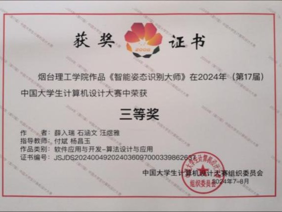 近日,中国大学生计算机设计大赛“软件应用与开发类”作品决赛在山东大学威海校区圆满落幕,我校信息工程学院参赛团队凭借作品“智能姿态识别大师”,在众多参赛队伍中脱颖而出,荣获国家三等奖,为学校赢得了荣誉。