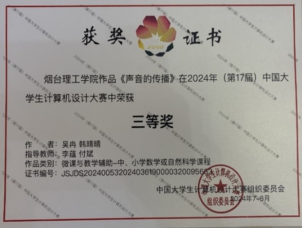 经作品展示、评委问辩、专家组复议等环节,本场大赛共评选出数媒静态设计类和微课与教学辅助类,全国一、二、三等奖共计700余项。我校信息工程学院的参赛团队由吴冉、韩晴晴两位优秀学生组成,他们在指导老师李蕴、付斌的精心指导下,反复推敲、不断打磨,精心设计出“声音的传播”这一创新作品。该作品凭借其独特的视觉、贴心的设计理念、先进的技术实现和广泛的实用性,赢得了评委们的高度认可和赞誉。