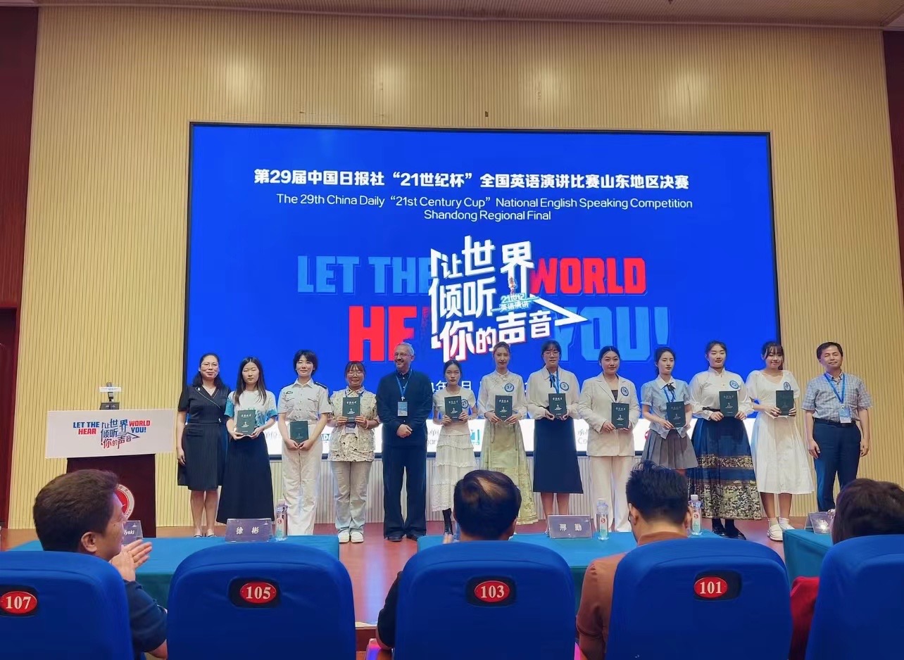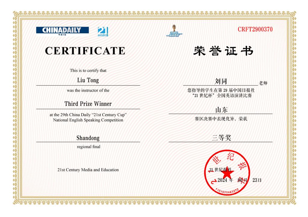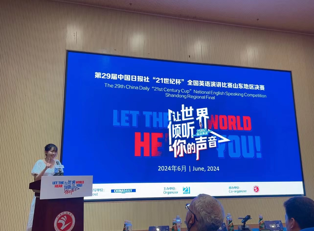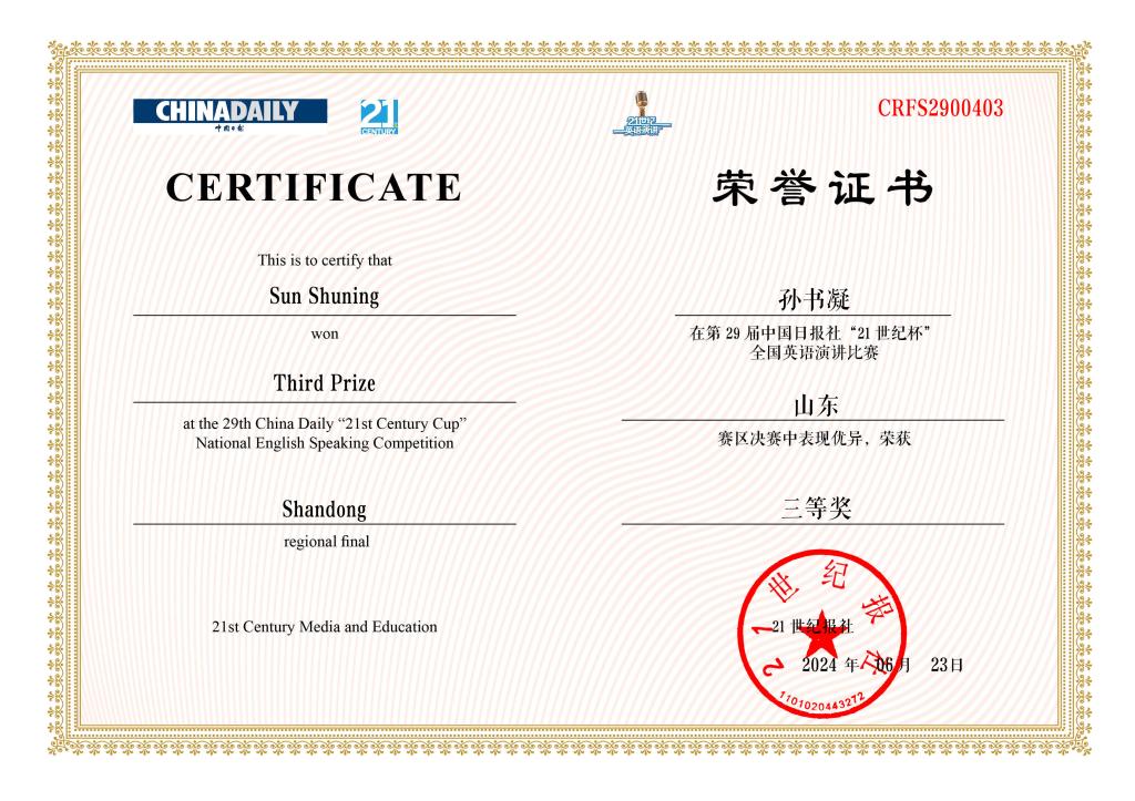 近日,第29届中国日报社“21世纪杯”全国英语演讲比赛山东赛区决赛落下帷幕。经过激烈角逐,我校孙书凝同学荣获山东赛区三等奖,刘同老师荣获优秀指导老师荣誉称号。