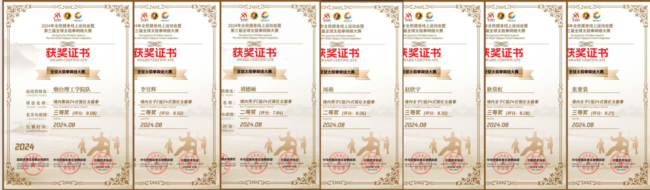 近日,2024年全民健身线上运动会暨第三届全球太极拳网络大赛圆满落幕,我校六名运动员分别参加女子C组、男子C组和集体24式太极拳比赛,获得二等奖3项、三等奖4项和网络人气奖的好成绩。