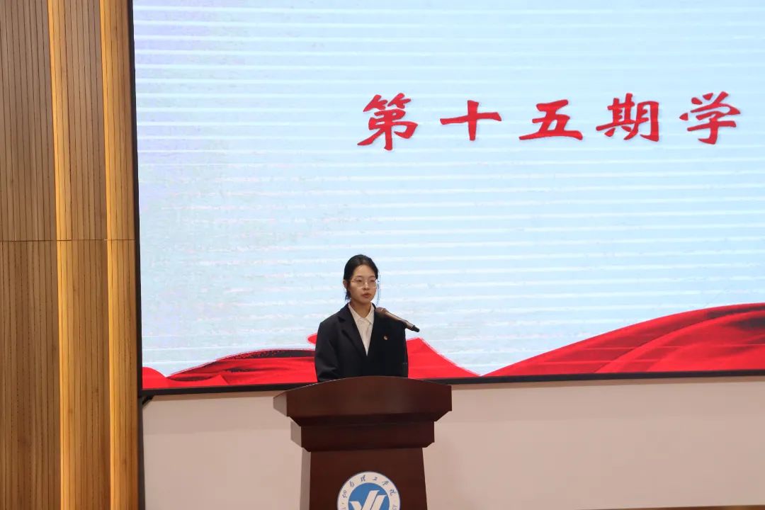 仪式在庄严的国歌中拉开帷幕,校长助理杜娟为第十五期青马工程骨干培训班授旗,党委组织统战部部长张琼玉为第十四期青马工程培训优秀学员颁发荣誉证书,党委宣传部部长杨帆为第十四期青马工程培训优秀学员颁发结业证书,第十四期青马工程优秀学员代表李梦竹发言分享心得,第十五期青马工程学员代表王灯阳发言。开班仪式结束后,马克思主义学院刘兆娟开启第十五期青马工程培训班理论培训第一讲。