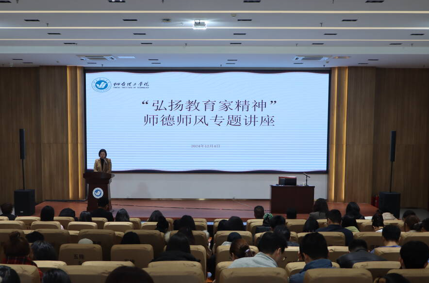 12月4日上午,烟台理工学院“弘扬教育家精神”师德师风专题讲座在综合楼六楼学术报告厅成功举办,食品与生物工程学院王晓洁教授主讲,各二级学院党总支书记、副书记,师德师风联络人、教师代表与会,党委教师工作部部长杨帆主持。