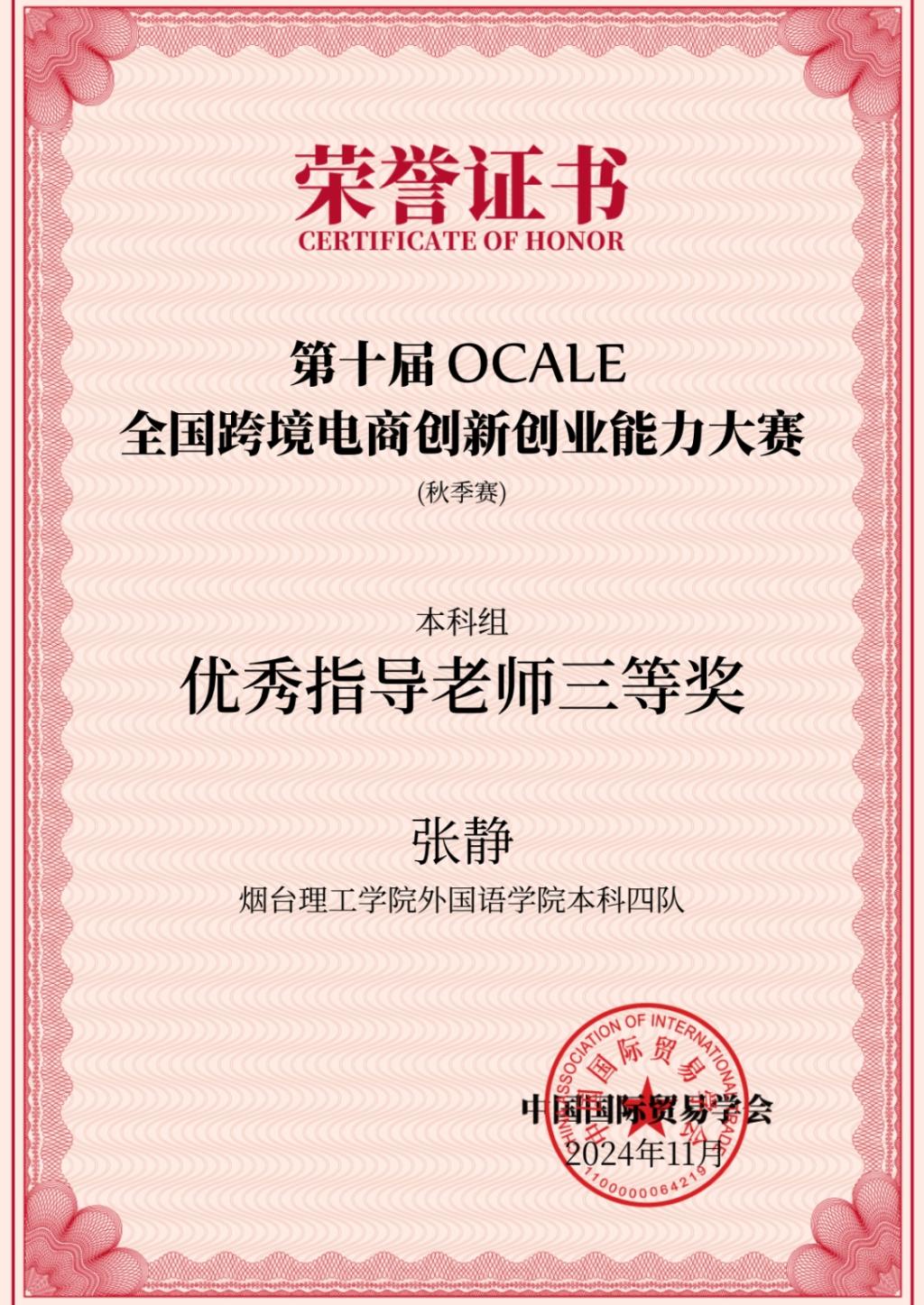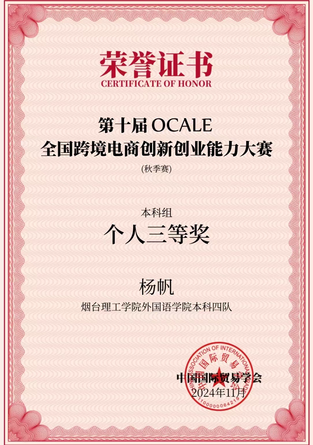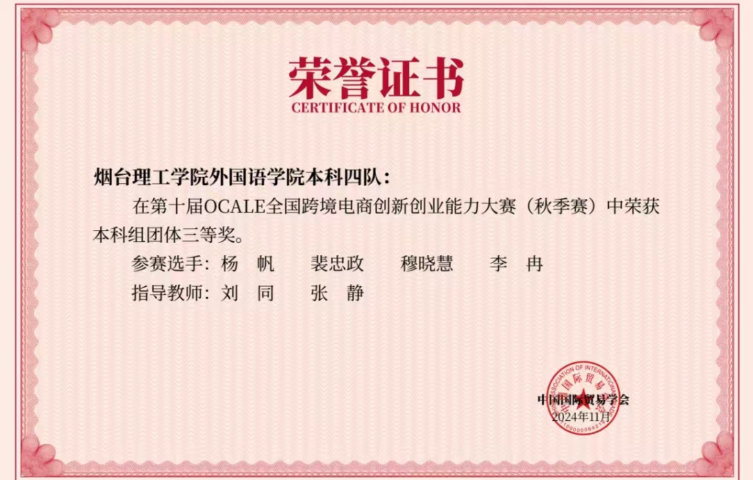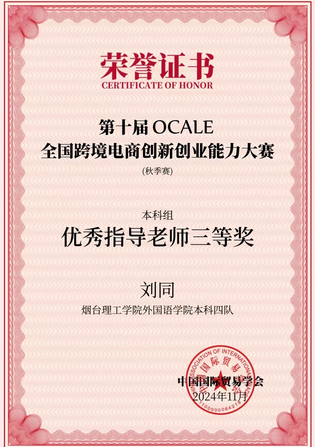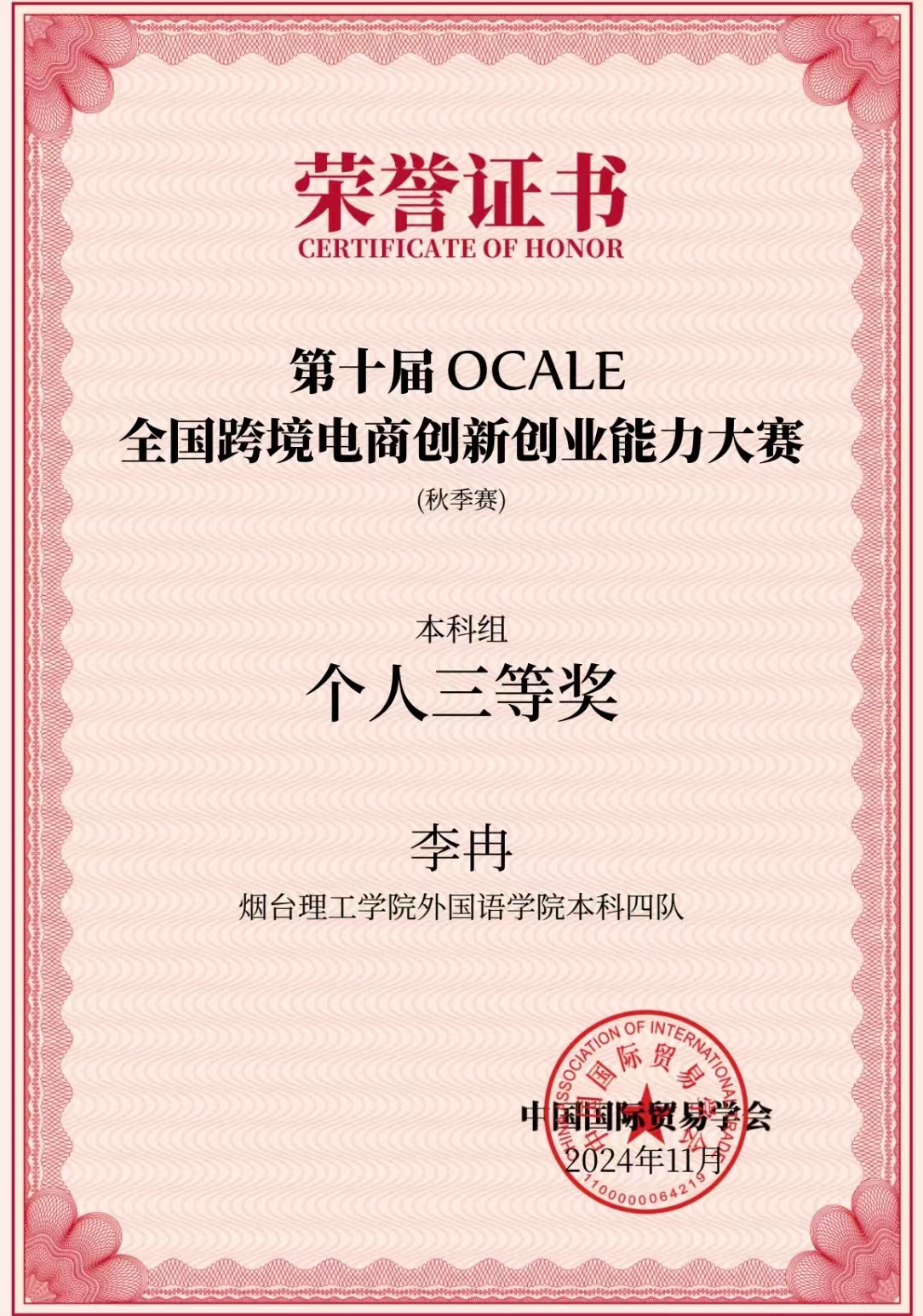 近日,备受瞩目的第十届OCALE全国跨境电商创新创业能力大赛(秋季赛)圆满落幕。本次大赛盛况空前,来自全国28个省(市)、自治区的438所院校、2416位指导老师和10756位参赛学生,共计2689支参赛队伍共同参与了这场智慧与勇气的较量。我校外国语学院团队(参赛选手:杨帆、裴忠政、穆晓慧、李冉;指导教师:刘同、张静)荣获本科组三等奖,展现出在跨境电商领域的专业素养和综合能力,尤其是运用数字贸易技术和数字贸易工具的能力,充分彰显了学院在数智化人才培养方面的卓越成效与实力。