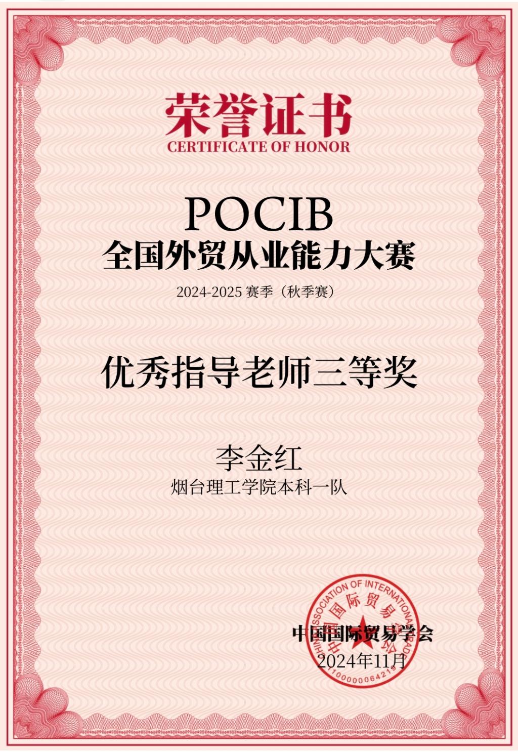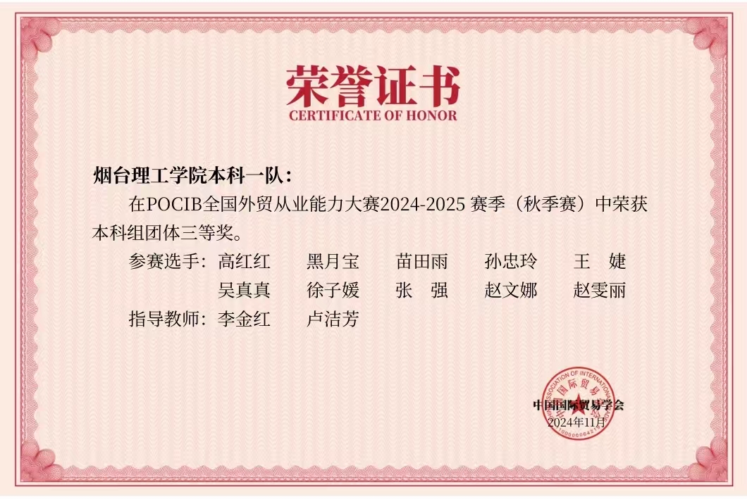 近日,由中国国际贸易学会主办,中国国际贸易学会培训处和南京世格软件有限责任公司承办的第十四届POCIB全国外贸从业能力大赛(2024-2025赛季秋季赛)落下帷幕。经过激烈角逐,由我校外国语学院李金红、卢洁芳老师指导的烟台理工学院本科一队(参赛学生:高红红、黑月宝、苗田雨、孙忠玲、王婕、吴真真、徐子媛、张强、赵文娜、赵雯丽)荣获本科组团体三等奖。