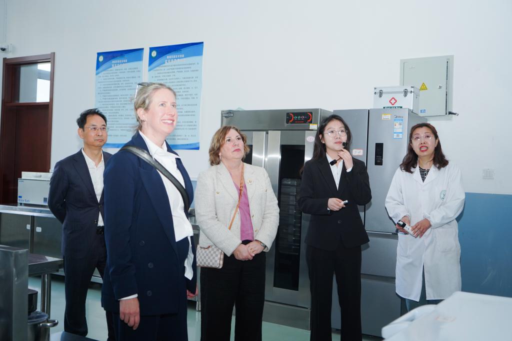 在食品药品综合实验中心,外宾观摩了工艺实验室、啤酒工艺实验室、果酒工艺实验室水处理室、微生物实验室等实验教学场地,了解了学校“产学研用”一体化成果。校史馆内,以校史为轴,向来宾阐释了“双六”办学理念如何赋能应用型人才培养。在大学生创业园中,外宾与各项目团队热情互动。
