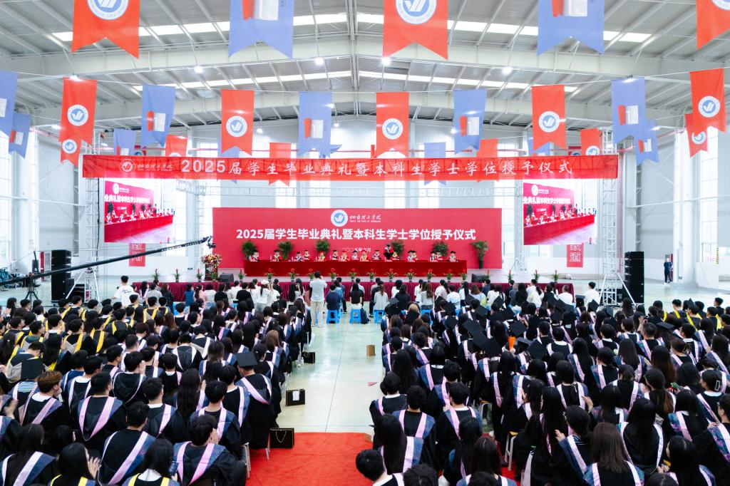 庄严的国歌奏响,全体师生肃立齐唱,毕业典礼拉开序幕。会上宣读了《关于表彰奖励2025年优秀本科毕业论文的决定》《关于表彰2025届优秀毕业生的决定》《关于表彰奖励2025年志愿服务西部计划毕业生的决定》。与会领导分别为优秀毕业生代表、志愿服务西部计划毕业生颁奖。董事长辛军、校长于光辉、党委书记盛国军为毕业生代表颁发学位证书并扶正流苏。