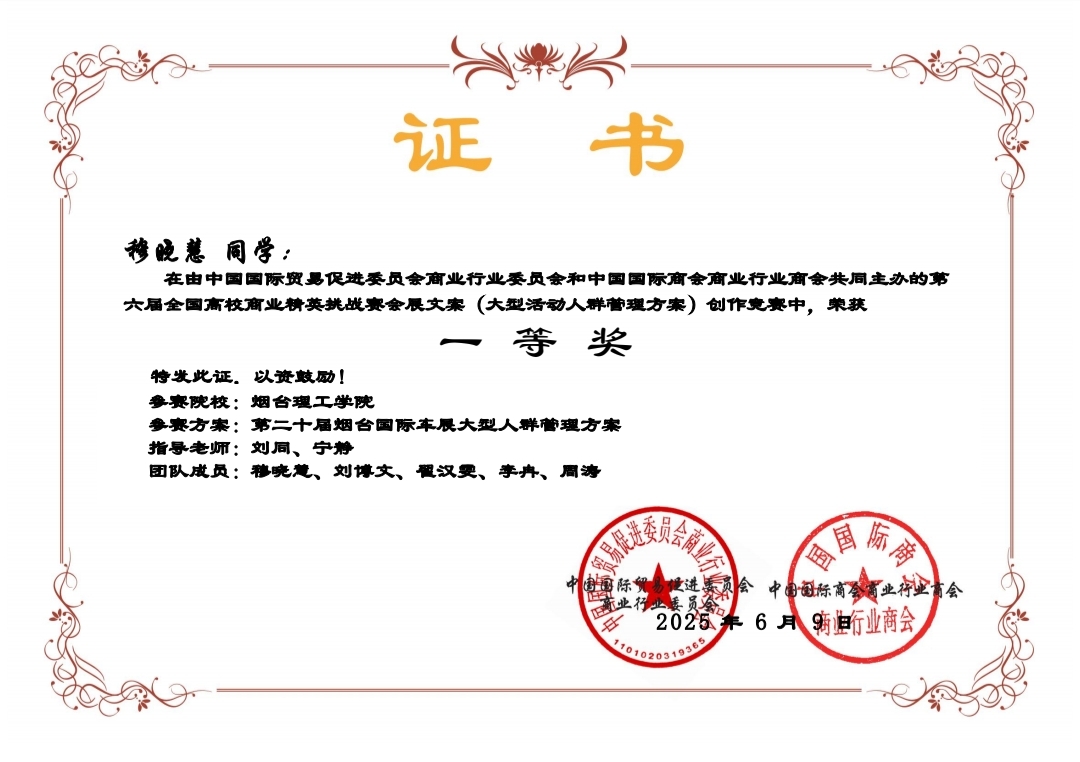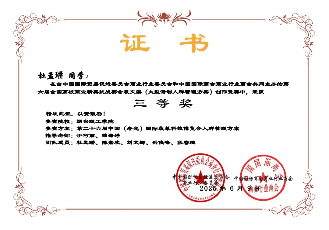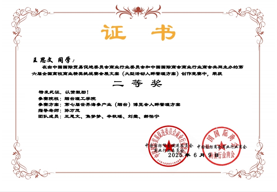 近日,第六届全国高校商业精英挑战赛会展文案(大型活动人群管理方案)创作竞赛全国总决赛圆满落幕。根据中国国际贸易促进委员会商业行业委员会与中国国际商会商业行业商会发布的《关于举办第六届全国高校商业精英挑战赛会展文案(大型活动人群管理方案)创作竞赛的函》(商贸促字〔2025〕66号),本届赛事吸引了来自全国26个省、自治区、直辖市的186所高校、398支队伍参赛。经过省赛选拔、组委会初评、专家复评及终审环节,最终共有133所高校、262支队伍、1800余名师生入围全国总决赛。