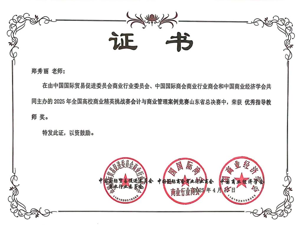 近日,2025年全国高校商业精英挑战赛会计与商业管理案例竞赛圆满落幕。经过激烈角逐,荣获全国二等奖三项及山东省赛事一等奖三项。指导教师郑秀丽、刘莹荣获“优秀指导教师”称号。