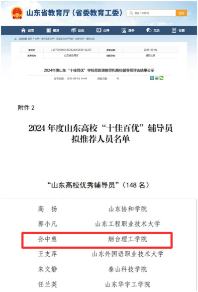 立德树人守初心,匠心育才担使命。近日,中共山东省教育厅(省委教育工委)公布了2024年度山东高校“十佳百优”辅导员评选结果,我校建筑工程学院团总支副书记孙中惠荣获“山东高校优秀辅导员”荣誉称号。