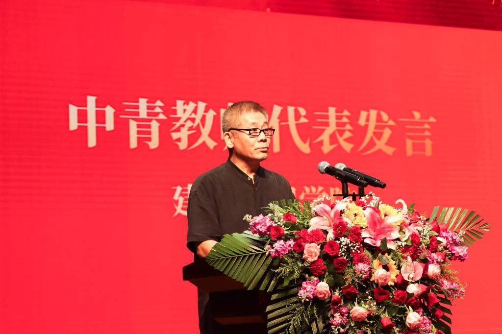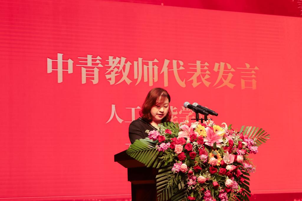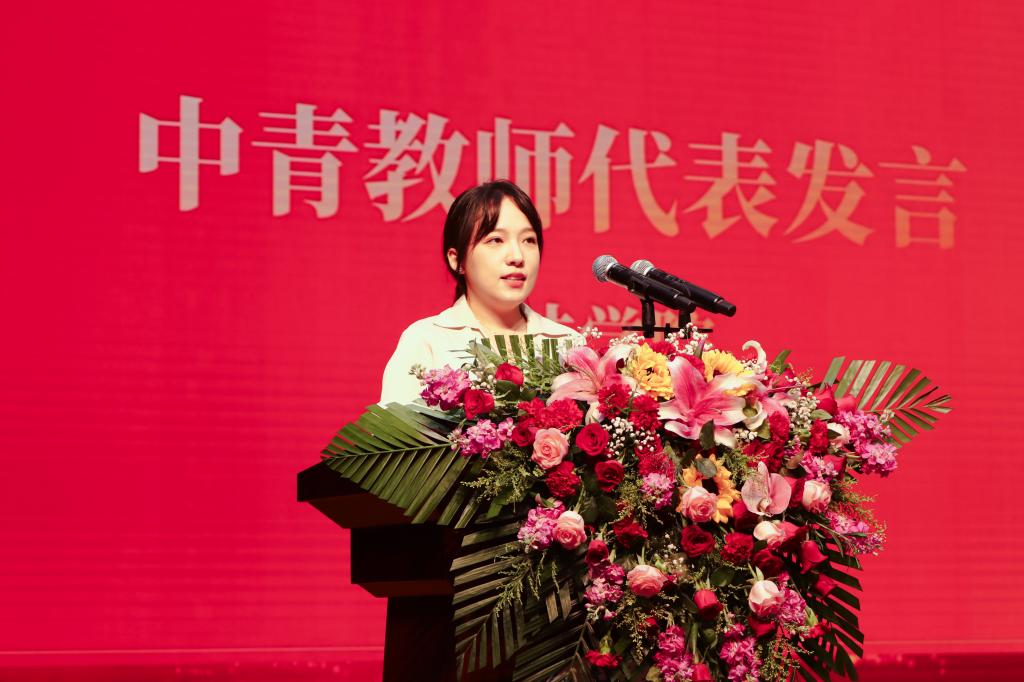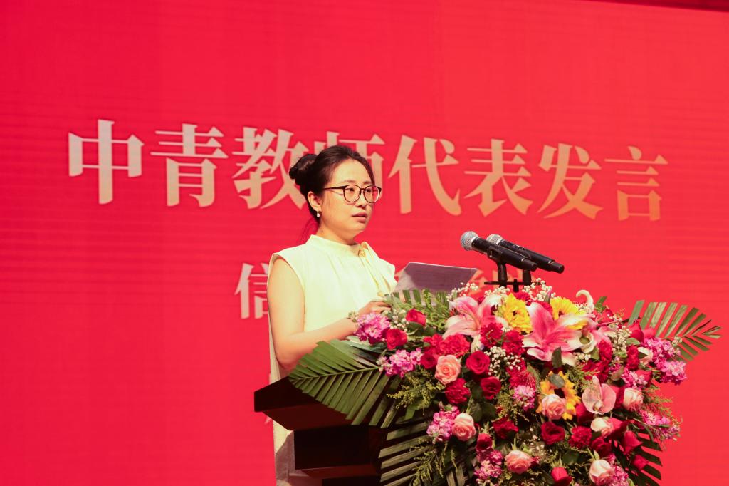 会上对第九届教学名师、优秀共产党员、优秀教师、优秀党务工作者等荣誉获得者进行表彰并颁发荣誉证书。中青年教师代表贾志林、高谦、徐嘉忆、唐晓婷相继上台发言,分享了他们的育人故事与教学感悟。