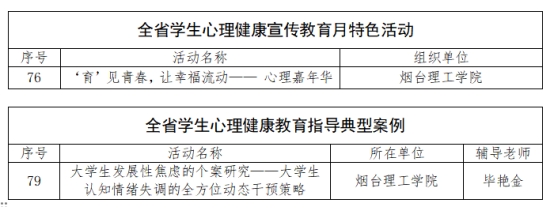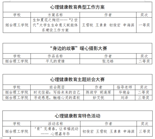 其中,由山东省教育厅主办的评选活动中,我校教师在特色活动及典型案例中共斩获两项奖项,在山东省大学生心理健康教育专业委员会组织的评选活动中,获奖5项。