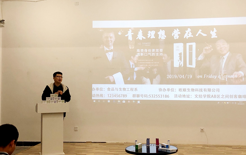 4月19日晚,食品系于二教路演室开展创业沙龙活动,诚邀烟台欧顺生物科技有限公司运营经理高宝山担任主讲嘉宾。食品系教研室主任王志宏、教研老师初晓辉及60余名学生到场参加。