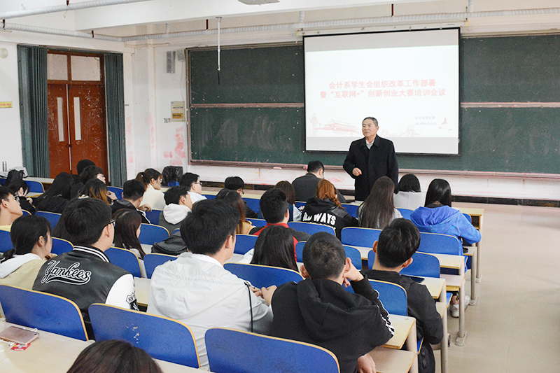 为使学生组织不断保持和增强政治性、先进性、群众性,认真履行自身职责,按照《学联学生会组织改革方案》和《高校学生代表大会工作规则》,4月13日,会计系在一教101召开学生会组织改革工作部署暨“互联网+”创新创业大赛培训会。会计系党支部书记张仁杰、团总支副书记秦红玉、辅导员纪靖欣、教师相福刚及全体学生干部参加会议。