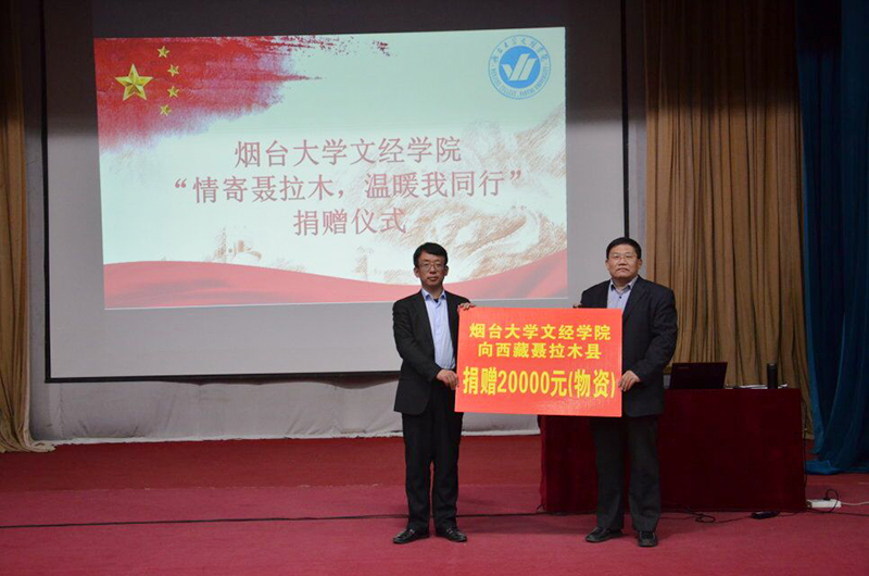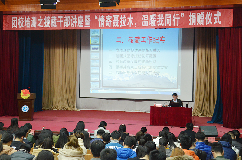 11月16日下午,第八期团校培训之援藏干部讲座暨“情寄聂拉木,温暖我同行”捐赠仪式在多功能厅举行,特邀西藏聂拉木县教育局副局长、烟台市第八批援藏干部刘永涛先生担任主讲。党委书记、副院长李相然,党委副书记李荣梅,各系团总支书记、副书记以及团校全体学员参加了本次活动。
