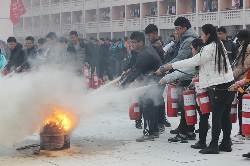 在引导人员的指挥下,同学们按既定逃生路线有序依次离开宿舍楼,在指定地点集合。保卫部部长徐宝军给同学们分析了大学校园里存在的消防安全隐患及有关火灾现场应急处置方案。保卫科安保员王华峰讲解了干粉灭火器和水基型灭火器使用要领以及相关注意事项,并做了具体示范。随后师生根据示范进行了油盆灭火实践,基本掌握了灭火器的使用方法。