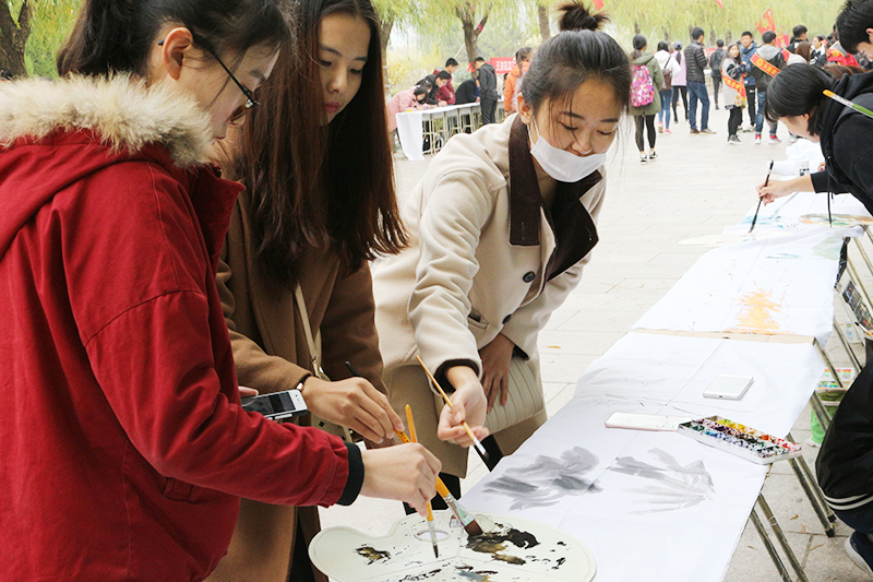 每个系随机抽取九个文化主题之一作为本系主题,在画布上进行艺术创作。比赛开始前,院团委与学生会各部门积极准备,百米画卷在柳树下铺展开来,颜料、画笔依次排开,参赛选手们信心满满,跃跃欲试。上午9时,创作大赛正式开始,选手们立即投入创作中,将自己对中国文化的深刻理解描绘于纸上:建筑系的“中国山水”意境深远,文法系的“中国建筑”气势磅礴,管理系的“中国神话”如梦如幻,食品系的“中国文学”意蕴深厚,经济系的“中国服饰”美轮美奂,外语系的“中国节日”热闹非凡,机电系的“中国民俗”纷纷攘攘,会计系的“中国武术”柔中带刚,信工系的“中国戏剧”出神入化,九个主题,各具特色,带给大家不一样的震撼。