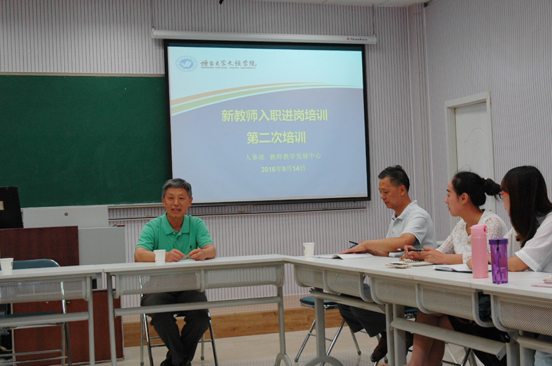 9月14日下午,烟台大学文经学院2016新入职教师培训第二讲在二教五楼微格室召开。学院人事部部长徐焕波、教师教学发展中心主任陈忠华与会。陈忠华主任主持会议。