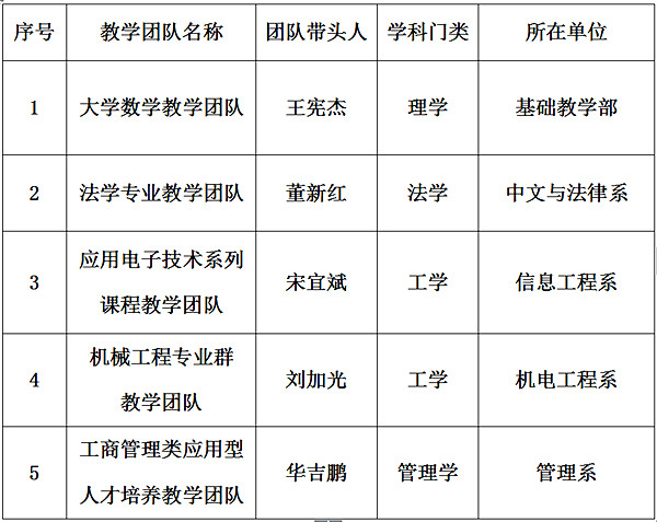 根据《烟台大学文经学院优秀教学团队建设实施方案(试行)》(烟大文经院字[2015]108号)的要求,我院教务部组织开展了首届优秀教学团队的申报、评审工作。在各系(部)、各单位申报推荐的基础上,经专家评审,报院长办公会讨论通过,确定了大学数学教学团队等5个教学团队为院级优秀教学团队建设立项项目(名单附后)。
