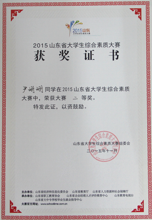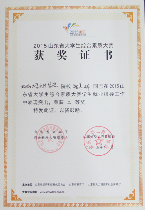 日前,2015年山东省大学生综合素质大赛暨青年人才评价推荐活动决赛在山东大学举行。经过激烈角逐,我院经济系国贸专业尹珊珊同学获山东省大学生综合素质大赛个人二等奖,招生就业部褚亮辉老师获学生就业指导工作二等奖,烟台大学文经学院首次获得优秀组织奖。