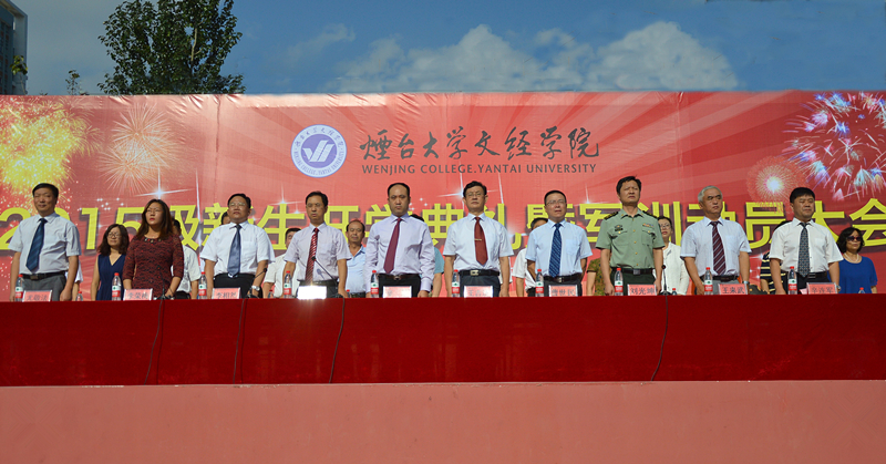 金秋九月,丹桂飘香。在全国上下隆重纪念中国人民抗日战争暨世界反法西斯战争胜利70周年之际,烟台大学文经学院迎来了2015级新同学。9月7日上午,烟台大学文经学院2015级新生开学典礼暨军训动员大会在学院体育场隆重举行。军训团团长、烟台警备区直工科刘光坤中校,烟台大学党委副书记王吉法教授,烟台大学文经学院董事长辛军,董事会董事曹世民,烟台大学文经学院院长于光辉,党委书记、副院长李相然,副院长王来武,党委副书记李荣梅,副院长辛连军,院长助理尤敬法以及各系部主任、党支部书记出席开学典礼并在主席台就座,李荣梅副书记主持大会。2015级全体新生在此聆听了他们的“大学第一课”。