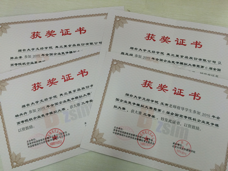 4月28-30日,第六届(2015)全国高等院校企业竞争模拟大赛全国现场总决赛在北京大学光华管理学院举行,我院学生杨丹丹、孙丛姿、殷玉阁组成的“再三里食品股份有限公司” 代表队凭借优异成绩获三等奖。
