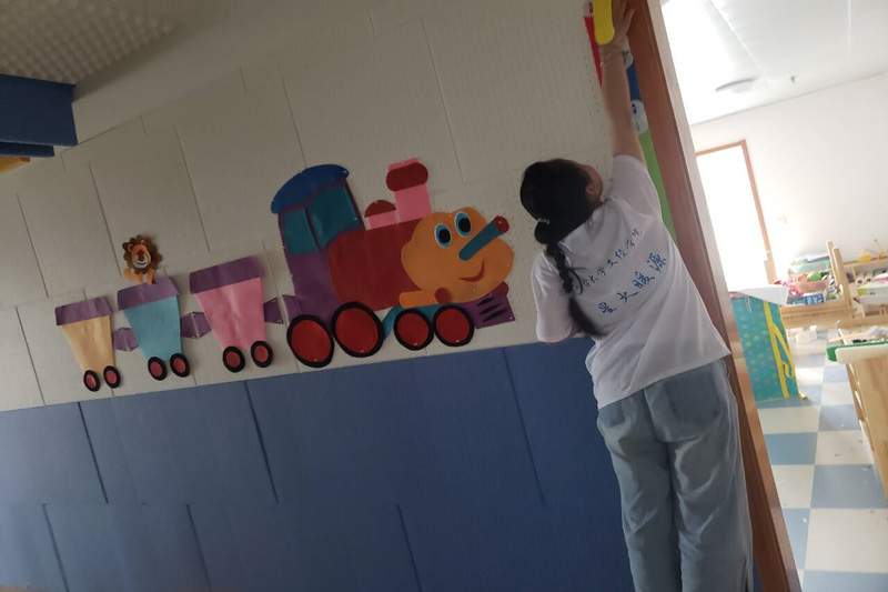 在接下来的几天时间里,星火暖源团队队员帮助每一位老师完成他们分配所需装饰的教室。剪纸、贴画、裁字等等,每位队员各司其职,秩序井然。在装饰教室的过程中,星火暖源团队队员偶遇到两名已经从心生元毕业的学生,并与他们一同制作装饰品,谈论中得知,他们两岁被送进心生元儿童康复中心,从一开始的完全听不到他人讲话并且自己也不会讲话直至现在为止装上人工耳蜗可以正常的与他人进行交流。在这几年的时间里,心生元的老师们付出了巨大的努力。
