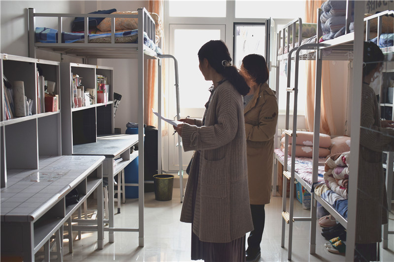 在本次卫生检查中,要求对优秀模范宿舍进行表扬,对脏乱差的宿舍、对存在安全隐患问题的宿舍要进行批评、提出警示。要将卫生和安全的检查工作落实到实处。随后,温少斐老师带领班主任及辅导员进行了分工检查。在检查过程中,老师们针对是否存在违规电器、桌面和地面整洁程度、橱柜是否上锁、物品摆放不整齐等情况对宿舍卫生进行评分,并与同学们进行了亲切的交谈,详细了解了同学们的住宿和生活情况。同时也提到,在宿舍安全和生活方面遇到问题要及时向辅导员反映,师生共同努力建设和谐安全的宿舍。