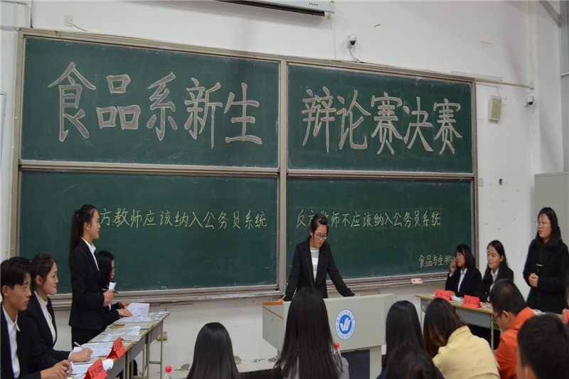 10月27日晚,食品系于二教111教室举办新生赛辩论赛决赛。比赛特邀学院各系辩论队队长、食品系学生会主席张慧琳及各部部长到场观看比赛。