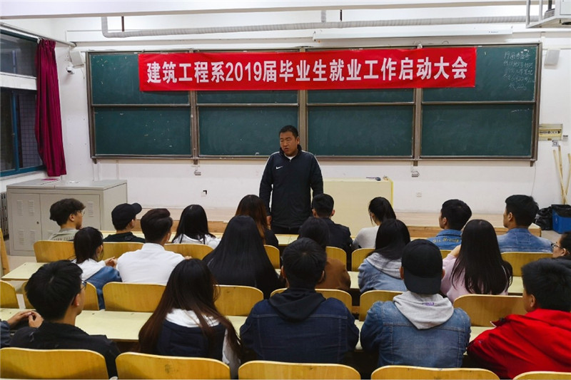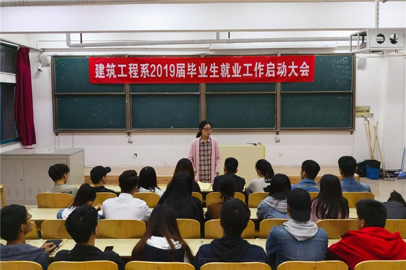 为了让建筑工程系毕业生了解当前就业形势,推动2019届毕业生就业工作。10月25日,建筑工程系在一教604教室举行了2019届毕业生就业工作启动大会。建筑工程系团总支负责人周科老师、2019届毕业生就业工作负责人宋冠静老师、建筑工程系辅导员老师及2019届毕业班级全体班长、团支书及班委成员参加。